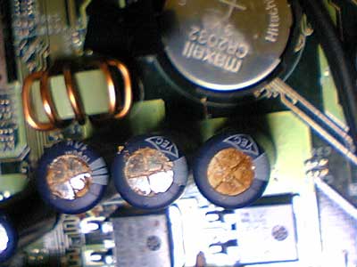 コンデンサの頭の茶色いのは液漏れです。上に見えるバックアップ用の電池も取り替えればよかったけど、また今度・・・