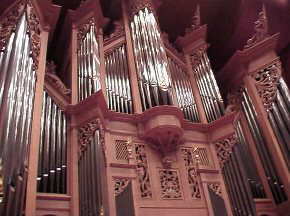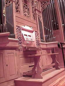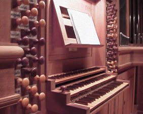 コンソール(演奏台)の様子。フランス古典(ヴェルサイユ期)オルガン用の楽器なので、ペダルや鍵盤の仕様も、わりとクラシカル。 水平ペダルではなく、平行ペダルです。 ストップの記憶装置がないので、日本のコンサート・オルガニストには、操作が少し大変みたい。 |
