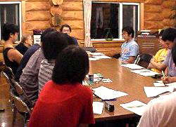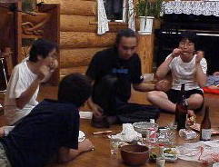 夜の飲み会で、アイヌの楽器「ムックリ」に挑戦するみんな。ムックリは、アジアの他の国にもあるそうです。 |