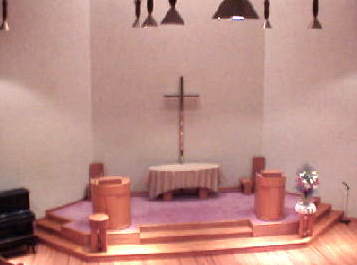 京都丸太町教会。2Fのオルガン席からの撮影。新築後5年だそうです。とても立派で、まるでホテルのようでした! おー、改めてこうして見ると、説教台やその他の台が「丸太」だ! 「丸太町」にかけているのかな? かわいいなぁ。 |