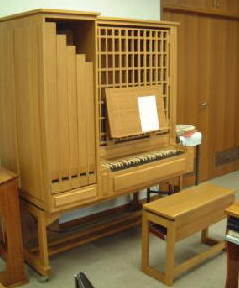 オルガン全景。ドイツ・ボッシュ社の作品。ペダル鍵盤のない、移動式オルガン。ストップ(音色)は、4つです。 |