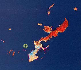 西、慶良間諸島の沖の海です。宜野湾マリーナから6ノットで走って約1時間半くらいのところ(左の地図の◎印)です。