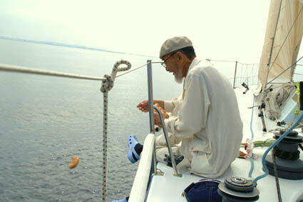 帰路には、この大型ヨットの「操舵」(?)もちょっとさせてもらいました(右の写真)。仲間たちや、沖縄の人びとへの感謝でいっぱいです。