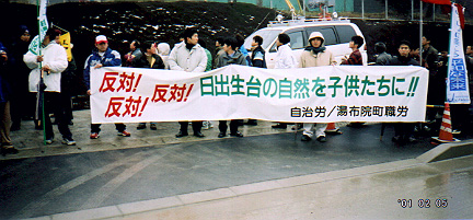 日出生台演習場正門での実弾演習反対「抗議」集会に参加した、地元・湯布院町職労の横断幕