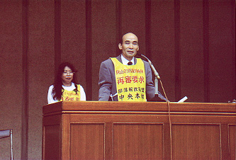▲狭山第2次再審闘争の完全勝利をめざして断固闘うと決意をのべる石川一雄さん、早智子さんご夫婦