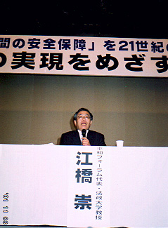 (3)今回のテロに対しては、軍事的報復では無く、地球規模での環境破壊や貧困、差別の問題を克服し、国際テロを含めた地球規模の脅威に対処する「人間の安全保障」の取組に、すべての国々と協力し、世界の人々ともに歩むことが重要です。時間がかかるようでも、この取組が憎悪の悪環境をとめ、テロ行為を根絶させる力になります。 写真はシンポジウムで問題提起の江橋崇平和フォーラム代表