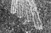 これがベトナムの上空で、B52から爆撃弾を落しているところで、そういう形で沖縄からは約2時間ぐらいで到達して、向こうで爆弾を落としてそのまま帰ってくるという形で、大体5時間ぐらいかけて爆弾を落してくるという形で、68年から70年にかけて約3年間爆弾を投下し、ベトナムでは言われているようにじゅうたん爆撃ということで、その一角を地図化して、事前にこの地図に基づいてベトナムに向かって、そこにじゅうたん爆撃をしてくるということがなされております。