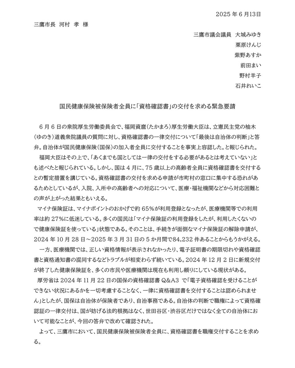 東京の渋谷区や世田谷区では、国保加入者が適切に保険診療を受けられるよう、国保加入者全員に資格確認書を一斉交付することを発表した。いらないネットでは地方自治体議員に、国保加入者全員に資格確認書送付を実現するよう呼びかけをしている(こちら参照)。