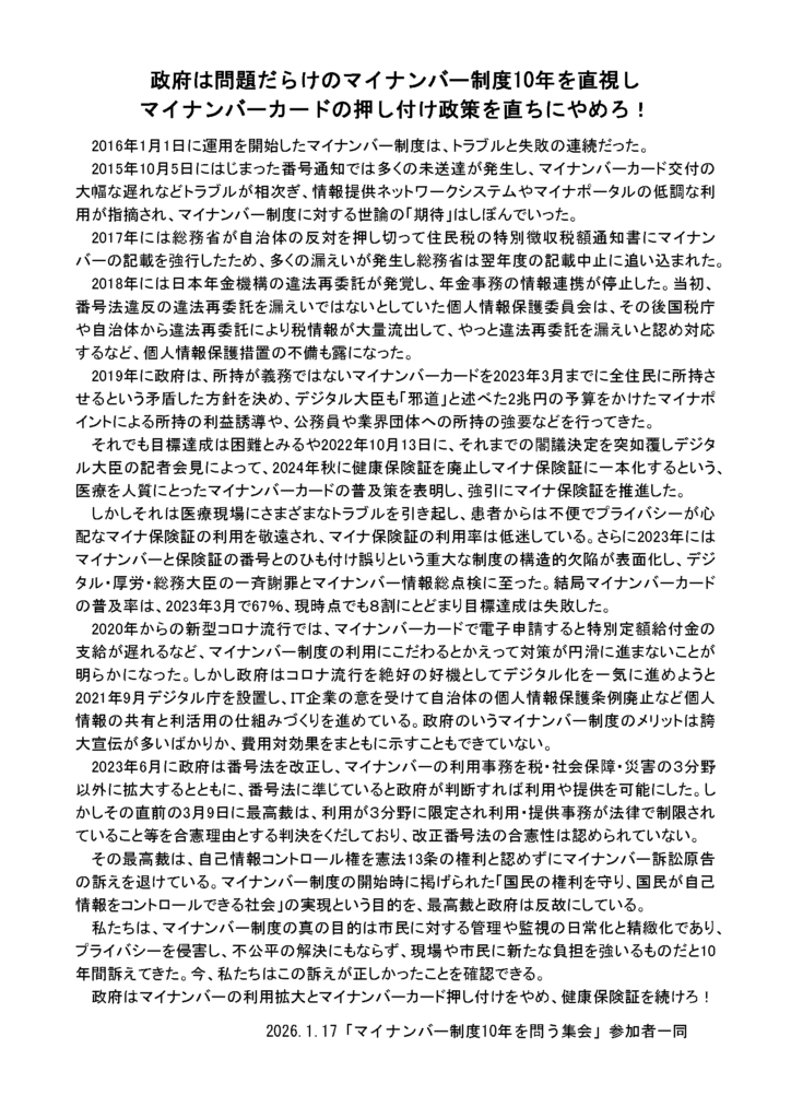 2015年2月にスタートした私たち共通番号いらないネットの運動も10年を越えた。