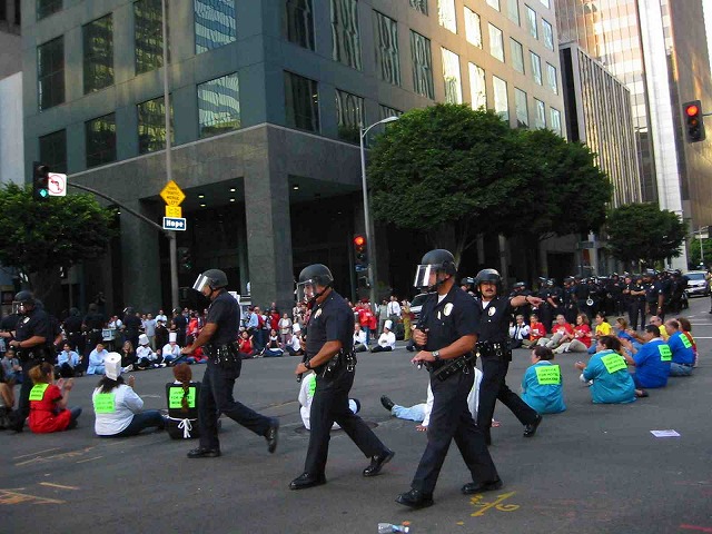 一人ひとりの逮捕が始まる10月5日には、2回目の市民的不服従行動がロスのダウンタウンのハイアット・リージェンシーホテル前で取り組まれました。メディア各社と約1000名の組合員、支援者たちが取り囲む中で、交差点に座り込んだ50名のUNITE-HERE役員(次期AFL-CIOの会長選挙に立候補すると言われている統合前のHEREの委員長だったJohn Wilhelmも参加)、組合員、地域の支援者たちが機動隊に逮捕されました。あらかじめロス市警とも打ち合わせ済みの行動ですが、メディアが報道し、組合員、支援者たちが団結を固め、経営に闘う意志を示す場として位置づけられていることがよくわかる行動でした。