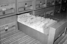 鶴見良行さんは市民の立場にこだわりながら独自のアジア学を切り開いたことで知られ、東南アジアの海辺を訪ね、太平洋の孤島に出かけて思索を深めていった在野の研究者です。厩大な資料を読み漁り、フィールドを繰り返し訪ねて著したたくさんの作品で、東南アジアや太平洋の民衆世界を描いてきた鶴見良行さん。「文庫」には、その鶴見ワールドの原点となった蔵書、写真、カード(左がその見本)、フィールドノート、著書が所蔵されています。……【右の写真が約2万枚のカードを収めたカードボックス
