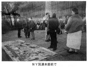 代表部訪問の後は国連本部向かいの歩道上で、監獄改革や死刑問題に力を尽くした人々の似顔を描いた大きな布を広げて、通行人にアピール。観光客も結構足を止めて眺めていた。
