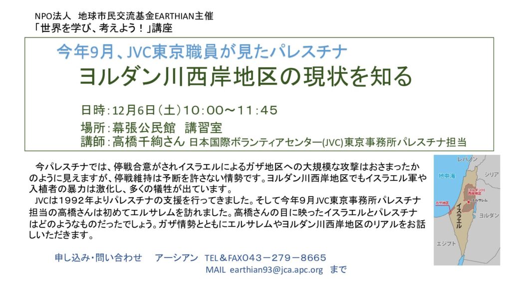 2025年11月7日 / 最終更新日時 : 2025年11月7日 アーシアン事務局(編集者権限) お知らせ 「世界を学び、考えよう!」講座 今年9月 JVC東京職員が見たパレスチナ「ヨルダン川西岸地区の現状を知る」開催のお知らせ 日時:2025年12月6日(土)10:00~11:45場所:幕張公民館 2階講習室詳細は下記をご覧ください。多くの方のご参加をお待ちしております。