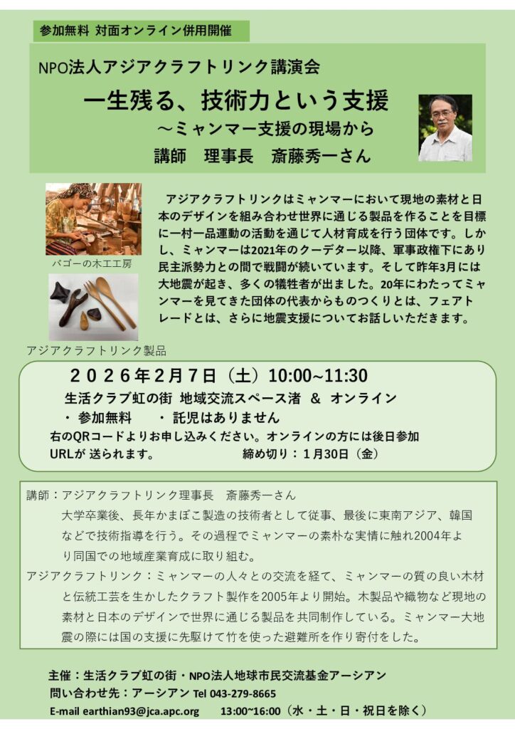 2026年1月16日 / 最終更新日時 : 2026年1月16日 アーシアン事務局(編集者権限) お知らせ NPO法人アジアクラフトリンク講演会 「一生残る、技術力という支援~ミャンマー支援の現場から」 日時:2026年2月7日(土)10:00~11:30 場所:生活クラブ虹の街 地域交流スペース渚「アジアクラフトリンク」の理事長 斎藤秀一さんを講師にお迎えし、講演会を開催します。多くの方のご参加をお待ちしております。詳細は下記チラシをご覧ください。