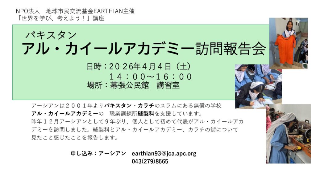 2026年3月10日 / 最終更新日時 : 2026年3月10日 アーシアン事務局(編集者権限) お知らせ 「パキスタン訪問報告会」開催のお知らせ:幕張公民館 2026年4月4日(土)幕張公民館にて「パキスタン訪問報告会」を開催します。昨年の12月にアーシアンの森田代表理事がパキスタンを訪問しました。アル・カイールアカデミー縫製科の様子など、写真を交えてお話しいたします。詳細は下記をご覧ください。多くの方のご参加をお待ちしております。