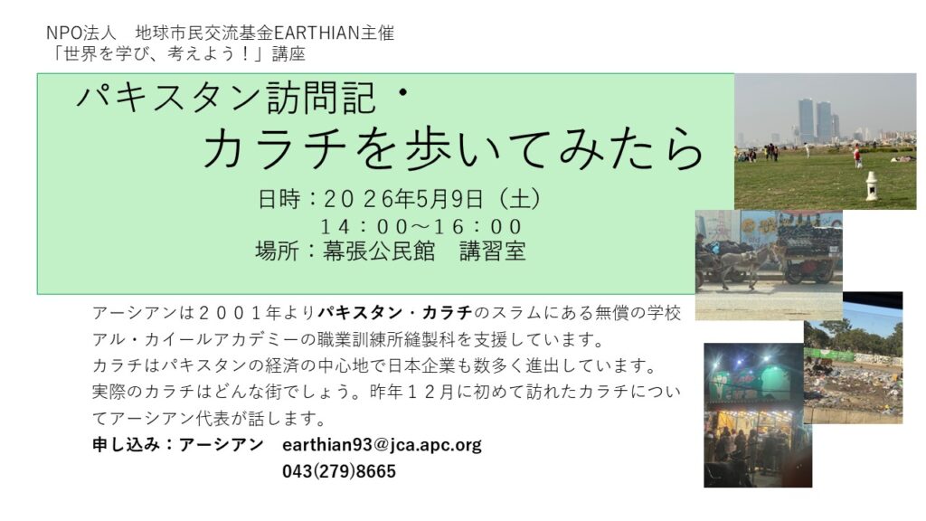 2026年4月21日 / 最終更新日時 : 2026年4月21日 アーシアン事務局(編集者権限) お知らせ 「パキスタン訪問記・カラチを歩いてみたら」 日時:2026年5月9日(土)14:00~16:00場所:幕張公民館 アーシアン代表が昨年末に訪ねたパキスタン・カラチの実際の様子を話します。少しでもご興味がございましたら是非お越しください。詳細は下記をご覧ください。
