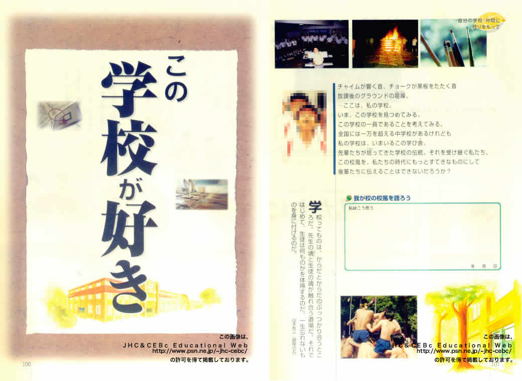 「集団の中の自分に胸を張れ」(P84~85・クリックするとそのページを表示します)は例によって書き込みの誘導尋問だね。「多くの仲間が、人の役にたちたいと考えています」って、ほんまかいな。まずは「個人」がどう社会のなかで扱われているか、ほんとうに大切にされているかどうかと思うがね。