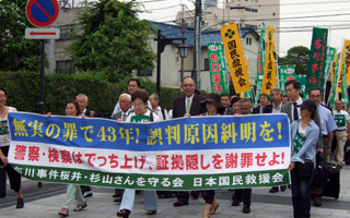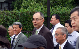 再審第1回公判で水戸地裁土浦支部に入る桜井さん、杉山さんと弁護団・支援者。菅家利和さんの姿も見える。(2010年7月9日午後1時)