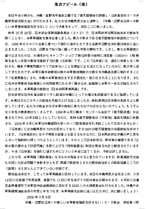 ○【集会報告】沖縄・辺野古への基地建設を許さない! 3・5集会&デモ〜 日米軍事再編反対!沖縄県民大会と連帯して闘おう!(各メッセージ掲載) (060306,08)