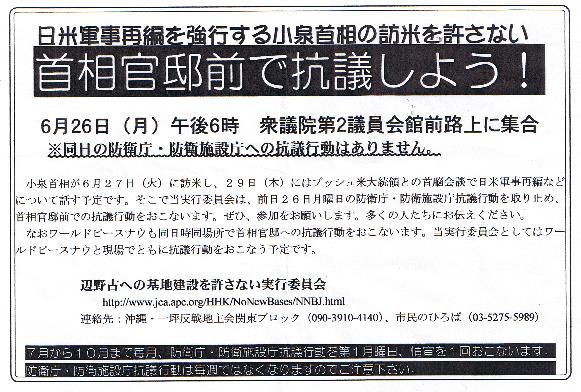 ○日米軍事再編を強行する小泉首相の訪米を許さない 首相官邸前で抗議しよう! (060622)
