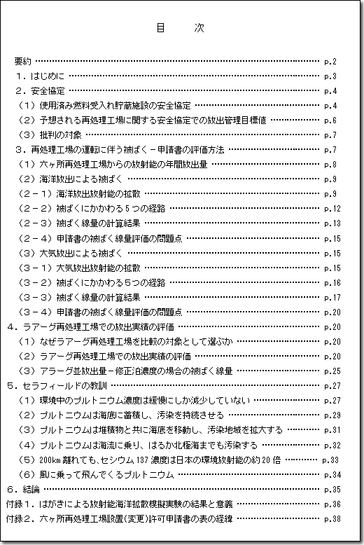 この小論では、その放出量と被ばく線量22μSvが虚構であることを2つの方法で具体的に示す。第1に、申請書ではずさんな海流想定によって泊漁港の放射能濃度を低くし、そこで採れる海藻類による被ばくを不当に低く評価していることを示す。第2に、ラアーグ再処理工場での放射能海洋放出実績と比較すると、六ヶ所での海洋放出量が不当に低く見積もられていることを示す。この2点の批判的検討によって、海洋放出分だけで被ばく線量は約80μSvに跳ね上がる。これは、ラアーグと六ヶ所で扱う使用済み燃料の燃焼度の差を考慮しない控えめな評価である。