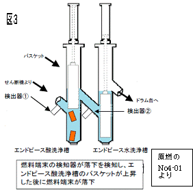 このバスケットは上下に動く間に硝酸が中を通り抜けてバスケット内のエンドピースを洗浄するらしい。酸洗浄が終わると、ちょうど右側の水洗浄槽への橋渡しをする管の位置にバスケットを止めて扉を開ける。今回はこの扉が歪んでいたという。 では、もう一つのトラブルであるエンドピースの落下はどうして起きたのだろうか。上記の歪んだ扉の位置から落下することはありそうにない。 実はエンドピース落下のトラブルは、原燃のトラブル等事例集のNo.4−01で以下のように想定されている。落下は図3のように、せん断機から導いたエンドピースを酸洗浄槽のバスケットに入れるときに起こるという。図3の検出器(1)が、せん断機から落ちてくるエンドピースによる振動