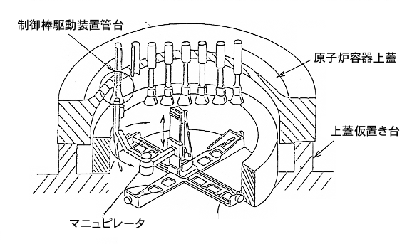 加圧水型炉の上蓋は、直径約5メートル、厚さ40cm。材質は低合金で、内側には厚さ10mm程度のステンレスが被覆材として溶接されている。そして、上蓋の上から制御棒駆動軸を通すため、インコネル製のステンレスの管台が40〜80本、上蓋を貫通して設置されている【資料1】【資料2】。これら、制御棒駆動機構(CRDM:Control