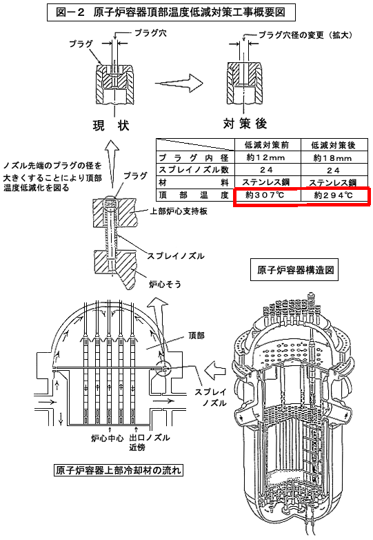 高浜3.4号、大飯3.4号については炉頂部の温度を低下させるように、原子炉容器内に流入した1次冷却材を頂部に導くスプレイノズルの内径を大きくする改造工事を実施した。