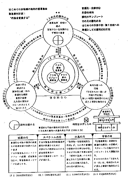 しかし、「はじめての生物圏の権利の集会」の精神的な法廷は、ほんのはじまりにすぎない。1996年3月21日の春分の日、集会の儀式的な完了の時点から、「世界規模の13の月に変える平和の運動」が、1996年6月26日、「13の月の勝利の日」に最高潮に達する大がかりな「平和への惑星規模の動員」を計画している。普遍的な停戦と、普遍的な非武装化プログラムの開始を求める呼びかけが、1996年7月26日までに、「子供たちの一団」によって実行に移され、前代未聞の暦の変革が普遍的に効力を持ち、そして四年間の「はじめての世界平和」が本格的にはじまる。