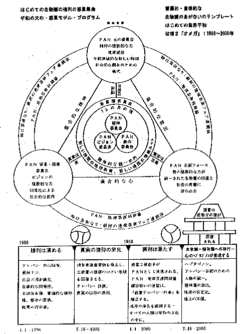 [はじめての世界平和、アルファ第一周期・予算]:1996年の磁気の月1日から1997年の共振の月14日まで。「小地球信託モデル」が包括的な地球変換信託およびプラネタリー・ストアへと移行する。ユネスコ、世界銀行、IMF(国際金融基金)、連邦準備銀行の協力を要請し、普遍的な移行モデル確立のために世界貿易委員会と協力する。