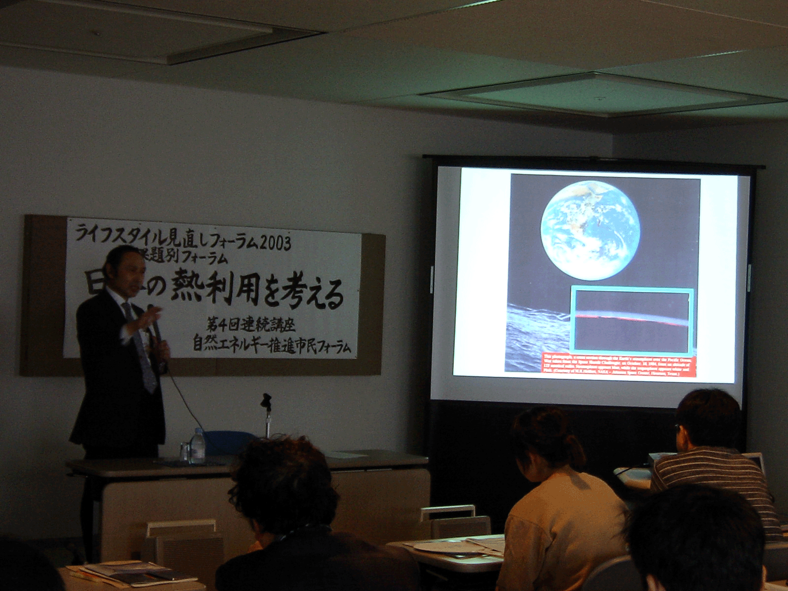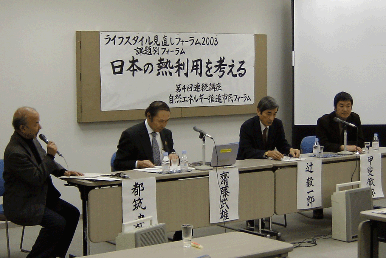2003年11月29日のREPP連続講座の第四回「日本の熱利用を考える」(講師:東北大学大学院教授 齋藤武雄氏(ヒートアイランドについて基調講演)、大阪大学教授辻 毅一郎氏(「家庭内のエネルギー消費実態調査から見えるエネルギーシフト」)、エコロジー住宅市民学校の講師 甲斐 徹朗氏(「私的な住まいつくり」と「地域環境の創造を結びつける事業戦略」を提案)は、学会レベルのお話をジョークや楽しいお話を交えて気楽に聞ける贅沢なものでした。雨の中、ご参加くださった皆さん、ありがとうございました!