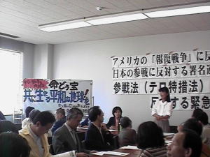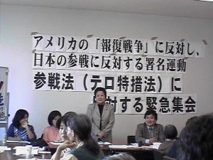 | ■ 集会には党首の土井たか子さんはじめ、6名の社民党国会議員が参加された。土井さんは「テロ特措法は自衛隊戦争参加法だ」と力強く反対を訴えた。 |