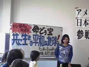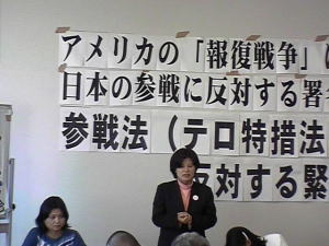 ■ 詩人の石川逸子さんが自作の詩「米、アフガン空爆開始の日に なぜ」「願い」を朗読された。 |