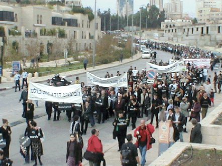 我々は、巨大な横断幕「占領は我々すべてを殺しつつある」を先頭に掲げて進んだ。同時に、黒地に白文字で「占領をやめろ」と書かれた幾百のプラカード、平和を求め、イスラエル国家と並ぶパレスチナ国家を要求する標識、この美しい都市エルサレム、かくも長くかくも多くの人々に愛されたこのエルサレムを分かち合うことを求める標識、等々が数多く掲げられた。季節はずれの暖かくすがすがしい冬の朝であった。そして我々は、このように共に行進しながら、にわかに希望に満ち力強く感じていた。警察は我々全員に歩道を歩かせようとしたが、すぐに我々は、道路を人で埋め尽くして路上いっぱいに広がり、予定のコースに沿って交通を遮断した。そしてエルサレムの「黒衣の女性たち」の長期にわたる支援者である「エズラ」が我々の間を歩き、1000本の赤いバラの花を黒衣の女性たちに配っていた。バラの花が尽きるまで。ただし女性たちの数は尽きなかった。