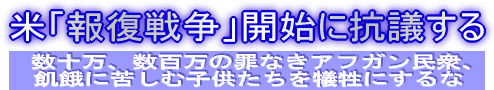 私たちは怒りと腹立ちを抑えることができません。8日未明、米英はアフガニスタンを空爆し戦争を始めました。アフガニスタンは主権国家です。アフガニスタンがアメリカに戦争を仕掛けたわけではありません。アメリカのやり方はあまりにも傲慢で横暴です。GDP統計さえなく、経済基盤も崩壊した国だから何をしてもいいというのでしょうか。空母3隻、6百機の航空機、3万人もの兵力を背景に、何の証拠も示さず一方的に戦争を仕掛けるなど言語道断です。アメリカは即刻空爆と特殊部隊の侵略行動を中止し全部隊を引き上げるべきです。