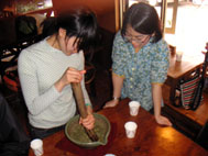 夕方近くなったので、夕食は秀妹阿媽の部屋で作って食べることにしました。阿媽の冷蔵庫の中から勝手に野菜やお肉を出してきて、メニューを考えます。阿媽からはぜひ食べてほしいと、台湾の旧正月には必ず食べるといわれるおいしいオモチが出されました。それに衣を付けて油で揚げて食べました。また蒸しパンや鶏肉のゆでたもの、ビーフン炒めとスープは秀妹阿媽の毎日使っている立派な中華フライパンで、メンバーのMさんやSさん、Nさんが作ってくれました。時間が経つのも忘れて、阿媽と一緒の楽しいおいしい食事の時間となりました。その後翌日の婦援会のワークショップでの再会を約束して、私たちは夜10時頃、阿媽の家を後にしました。