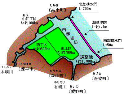 このため、本事業によって諫早湾の一部を潮受堤防で閉め切り、その内部に淡水化された調整池を設け、かんがい用水が確保された優良農地を造成するとともに、調整池の水位をマイナス1mに管理することにより高潮、洪水、常時排水不良等に対する防災機能を強化するものです。