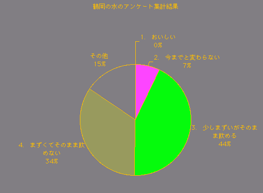 ■鶴岡水道 水源切り替え直後の住民意識アンケート第一次集計結果。 鶴岡市民 10/20〜12/24 ■全体のうち、78%は水質の低下を感じている。ペットボトルの水を飲み始めた人は13名、浄水器をつけた人は18名など、自己防衛しはじめている事を感じていただきたい。 ■鶴岡市内アットランダムに約200通を聞き取りや、喫茶店にアンケート用紙を配ったりなどをして集めた。12月23日現在123通。ここに中間報告を記す。 |