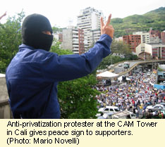 回答:2002年1月に、パストラナ大統領はカリの人々、労働者、そしてカリ市長と同意に達しました。合意内容は、EMCALIを私営化も精算もしないということでした。また、カリ住民に対する低価格のサービスも保証することとなりました。けれども、ウリベ大統領の立場は、この合意を尊重しないというものです。そして、彼の政策は「公共」のものではなく、公共/人々のことを好んでいません。全く逆に、ウリベの政治は国営ビジネスを私営化し、国営ビジネスを精算するというものです。前政権との間で交わされた合意を無視するというウリベの決断を考え、そして、カリの公共企業を私営かすることは望まないと述べたカリ住民との合意を無視するという決断を考えると、ウリベの政策に対する反応が起きるのは明らかです。労働者からだけでなく、コミュニティからも、そして私のような政治家からも。私たちは、カリの人々に明らかに悲惨をもたらすようなこうした政策に反対して抗議するよう人々に呼びかけています。EMCALIの自然な所有者はカリの人々なのです。