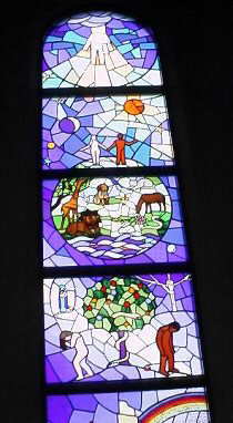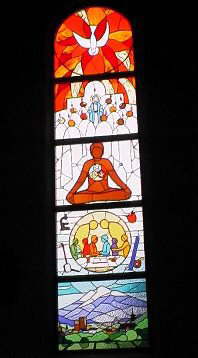 会堂の両脇に彩られているステンドグラスは、1984年カナダのカーロン神父の作品。