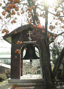 | 玄関。この日は残念ながら、礼拝堂を見ることは出来ませんでした。内部は撮影禁止(函館も、そうでした)。見学は事前に予約が必要です。 | 鐘もステキだけれど、この柿が見事! まさに晩秋・初冬の秋田の風景ですね・・。 |