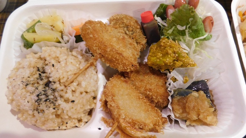 野菜食堂のお持ち帰り弁当です。このサイズのお弁当で、770円。860円670円もあります。胚芽米(雑穀4種類入り)と玄米を選べます。