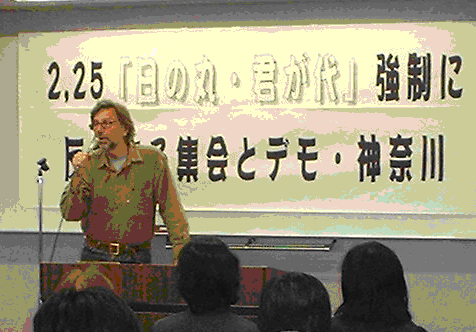 2月25日、横浜市技能文化会館で「日の丸・君が代」強制に反対する集会が「日の丸・君が代」の法制化と強制に反対する神奈川の会の主催で行われ、約180人が参加した。 集会は、主催者の開催あいさつから始まった。神奈川の会の京極さんは、この間の県内の学校現場における「日の丸・君が代」強制実態、推進派による反対派や行政当局に対するいやがらせなど報告した。また、会による行政当局との交渉について紹介し、「行政は、なぜ・日の丸・君が代・をやらなければいけないのかという説明を・助役が議会でやると言ったから・という程度にすぎず、無責任な対応を行っている」と批判した。 次にダグラス・ラミスさん(政治思想史研究)の講演が行われ、京都「君が代」訴訟の過程で提出した意見書「『服従』を強い、『屈辱心』を植えつける『君が代』」(1999年7月)を中心に問題提起した。 ダグラスさんは、@アメリカ人である私が何故、日本の天皇制・「君が代」について発言するのかA「君が代」強制は、愛国心ではなく「恐怖心」を植え付けるBアメリカの学校での「忠誠の宣誓」は、戦争ばかりするアメリカ人を作ったC「自分を管理している組織を愛せよ」ではなく、「自分の生れ育った谷間を愛する」について述べた。そして、「『君が代』は、『私をいじめないで…。服従します』という屈服を強制する歌だ」と批判し、提起の最後に「君が代」のパロディ代え歌を披露し、会場を笑わせた。 続いて連帯アピールが、畑野君枝参議院議員(日本共産党)、米原横浜市会議員(市民の党)、神奈川教育労働問題研究会、教科書の民主的採択を求める神奈川の会、一橋大学、「日の丸・君が代」強制に反対する市民運動ネットワーク、愛知「日の丸・君が代」の強制を考えるネットワークなどから行われた。