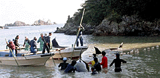 早朝から始まった、水族館に売却される5頭のオルカの捕獲の後、湾内に残った5頭はリリースされた。しかし、湾内からなかなか出ていこうとせず、ボートの船外機で脅かされながら、やっと沖に向かった。 |