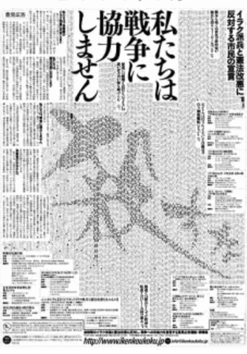 5月3日「憲法記念日」の反戦意見広告は、今年は『朝日新聞』の朝刊に掲載されます。「ニュース」欄のNo.244に報告してありますが、今年の意見広告はこれまでの倍の大きさでフル・カラーの印刷です。毎年と同じく、鈴木一誌さんのレイアウト