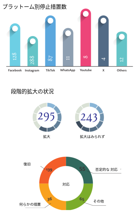 自動化モデレーションが拡大し、約3880万件の投稿が削除された。ポリシー違反ではないパレスチナ側の見解を表明した投稿が頻繁に削除対象となり、親パレスチナ表現に不均衡な影響を与える組織的な検閲が明らかになった。14