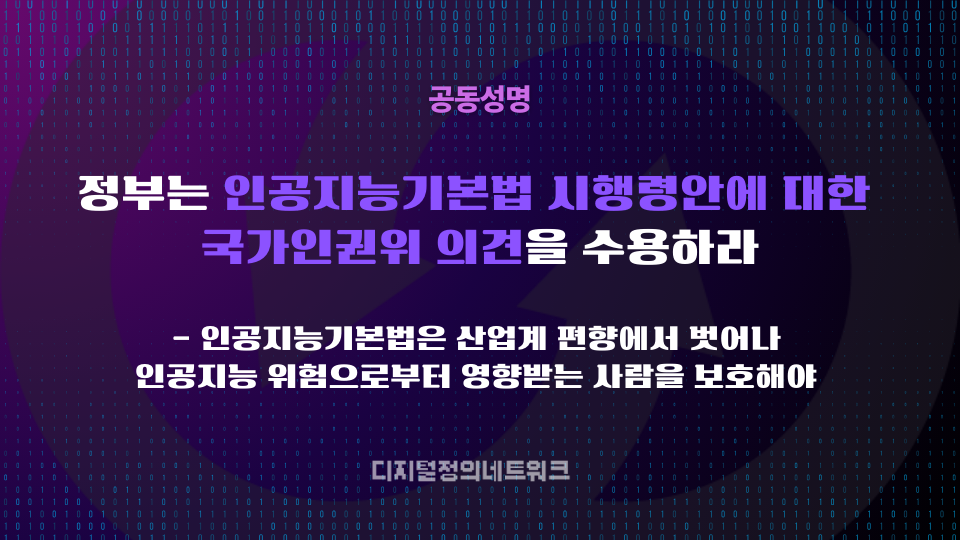 先の〔2025年〕12月21日、国家人権委員会[2]が「人工知能の発展と信頼基盤の造成等に関する基本法」[3](以下「人工知能基本法」)施行令案に対する改善意見[4]を出した。来年〔2026年〕1月22日の施行を前にして科学技術情報通信部[5](以下「科技部」)が公開した人工知能基本法施行令案が人権保護の観点から大幅に補完されなければならないということだ。私たちの団体は、政府が人工知能基本法施行令案に対する国家人権委員会の意見を受容することを強力に催促する。
