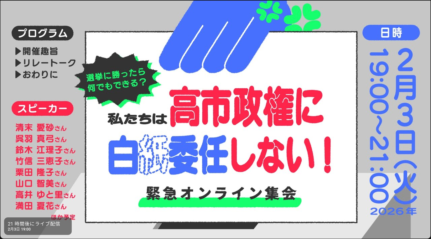 【2/3(火)19時】「近づく強権政治 私たちは高市政権に白紙委任しない!緊急オンライン集会」(詳細はこちら)