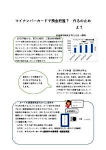<blockquote class="wp-embedded-content" data-secret="lag5xL6hOP"><a href="https://www.jca.apc.org/activist/?attachment_id=1254">3_MyNumber20May_tirasi</a></blockquote><iframe sandbox="allow-scripts" security="restricted" src="https://www.jca.apc.org/activist/?attachment_id=1254&embed=true#?secret=lag5xL6hOP" width="600" height="400" title="“3_MyNumber20May_tirasi” — 共通番号(マイナンバー)いらないネットブログ" data-secret="lag5xL6hOP" frameborder="0" marginwidth="0" marginheight="0" scrolling="no" class="wp-embedded-content"></iframe><script type="text/javascript"> /* <![CDATA[ */ /*! This file is auto-generated */ !function(d,l){"use strict";l.querySelector&&d.addEventListener&&"undefined"!=typeof URL&&(d.wp=d.wp||{},d.wp.receiveEmbedMessage||(d.wp.receiveEmbedMessage=function(e){var t=e.data;if((t||t.secret||t.message||t.value)&&!/[^a-zA-Z0-9]/.test(t.secret)){for(var s,r,n,a=l.querySelectorAll('iframe[data-secret="'+t.secret+'"]'),o=l.querySelectorAll('blockquote[data-secret="'+t.secret+'"]'),c=new RegExp("^https?:$","i"),i=0;i<o.length;i++)o[i].style.display="none";for(i=0;i<a.length;i++)s=a[i],e.source===s.contentWindow&&(s.removeAttribute("style"),"height"===t.message?(1e3<(r=parseInt(t.value,10))?r=1e3:~~r<200&&(r=200),s.height=r):"link"===t.message&&(r=new URL(s.getAttribute("src")),n=new URL(t.value),c.test(n.protocol))&&n.host===r.host&&l.activeElement===s&&(d.top.location.href=t.value))}},d.addEventListener("message",d.wp.receiveEmbedMessage,!1),l.addEventListener("DOMContentLoaded",function(){for(var e,t,s=l.querySelectorAll("iframe.wp-embedded-content"),r=0;r<s.length;r++)(t=(e=s[r]).getAttribute("data-secret"))||(t=Math.random().toString(36).substring(2,12),e.src+="#?secret="+t,e.setAttribute("data-secret",t)),e.contentWindow.postMessage({message:"ready",secret:t},"*")},!1)))}(window,document); /* ]]> */ </script>