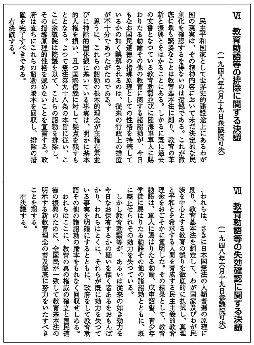 1948年6月19日、上掲のように衆参両院はそれぞれ「教育勅語の排除に関する決議-衆議院」「教育勅語の失効確認に関する決議-参議院」を可決した(資料3)。これらの決議文は誠に明快でわかりやすく解説の必要はない。文章の長さも趣旨もほぼ同じで、「わが国家及びわが民族」を中心とした教育の誤りを徹底的に払拭し、真理と平和を希求する人間を育てる民主主義的教育理念を厳かに宣言したものである。これによって教育勅語は国民の代表である衆・参両院の議員によって排除・失効を決議され、その意義を称賛するものが再び現れないよう法的にとどめが刺されたのである。
